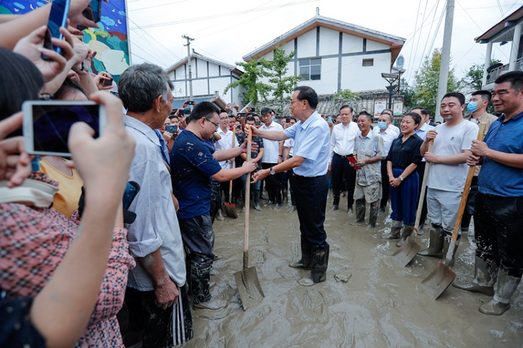 李克强8月20日上午11时许飞抵重庆,一下飞机马上转乘火车、汽车,一路辗转来到洪水灾情严重的潼南区双坝村。李克强对当地干部和随行人员说,要落实好习近平总书记对防汛救灾和灾后重建工作的重要指示精神,确保人民群众的生命财产安全。双坝村位于涪江沿线,全村8000多人全部受灾,屋内积水最高时达一人多高,村庄周围的农田、蔬菜大棚全部损毁。总理沿途看望慰问受灾群众,走进水毁房屋、受灾农田和受灾群众安置点等,询问大家有什么具体困难,需要国家哪些政策支持。总理表示,党和政府一定会帮助大家渡过难关。村民们告诉总理,我们从来没有见过这么大的洪水,很多在外打工的人都回家来救灾,所幸没有造成人员伤亡。李克强说,家是最有凝聚力的,这么大的灾害大家一起努力顶住了,没有人员伤亡就是最大的胜利。你们这里涪江、嘉陵江几条江上过去都有纤夫,涪江的号子是很雄壮的。你们现在的行动实际上也是在唱响涪江号子,大家齐心协力,就一定能够把家园重新建设好。